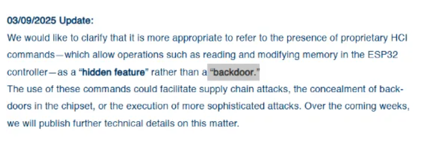 目前,Tarlogic官网显示已经于当地时间3月9日对上述内容做了更新和澄清,将上述指令用“hidden feature”(隐藏功能)替代“backdoor”(后门),表示使用这些命令可能会促进供应链攻击、隐藏芯片组中的后门或执行更复杂的攻击。