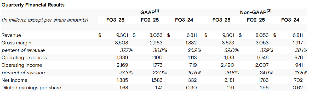 美光2025财年第三季度(截至5月29日)营收达93亿美元,环比增长15.5%,同比飙升36.6%,远超分析师预期的89亿美元。Non-GAAP净利润21.8亿美元(每股收益1.91美元),同比激增208%,显著高于预期的1.60美元。经营现金流增至46.1亿美元,同比提升86%,印证盈利质量改善。首席执行官Sanjay Mehrotra指出,增长主要由DRAM收入创新高驱动,其中数据中心业务营收同比翻倍,消费端市场同步走强。