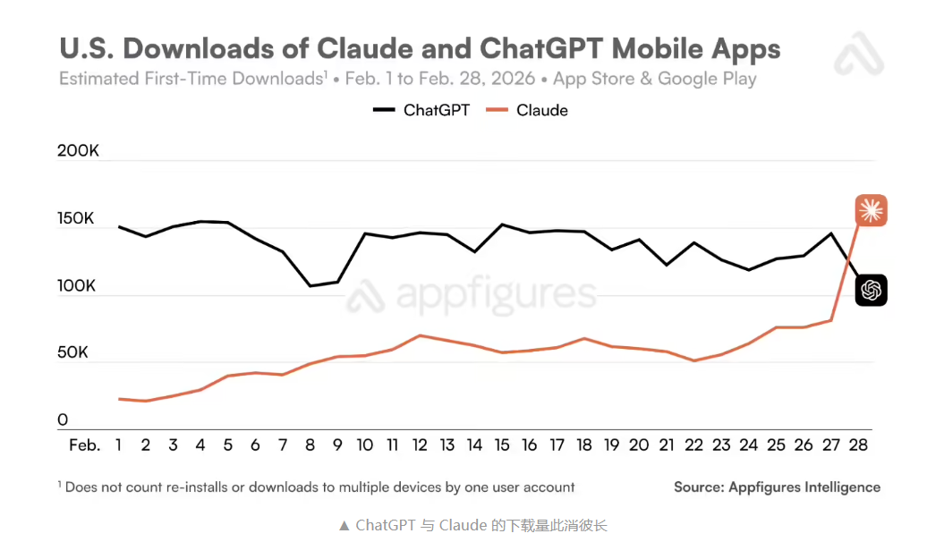 OpenAI 与美国国防部达成的 AI 合作引发了众怒。ChatGPT 在美国的卸载量暴增,大量用户给出 1 星评价。