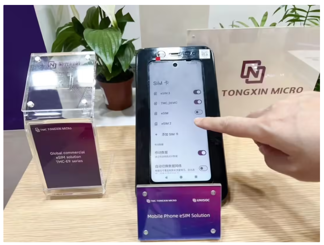 紫光同芯首次公开展示了融合地面与卫星网络鉴权能力的新一代eSIM芯片THC9E。