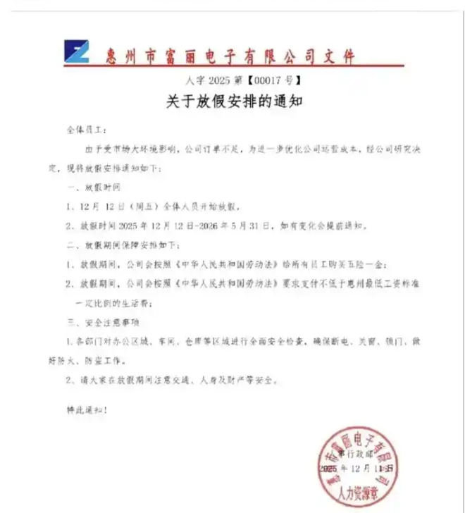 惠州富丽电子有限公司宣布自2024年12月12日起全员放假至2026年5月31日