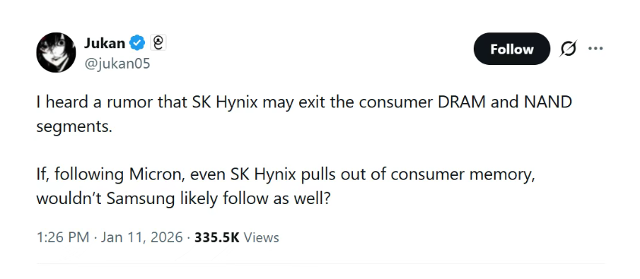 市场传出SK海力士正考虑退出利润微薄的消费级DRAM与NAND闪存业务。