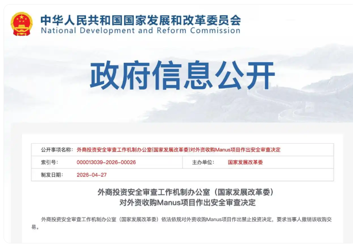 外商投资安全审查工作机制办公室(国家发展改革委)依法依规对外资收购 Manus 项目作出禁止投资决定,要求当事人撤销该收购交易