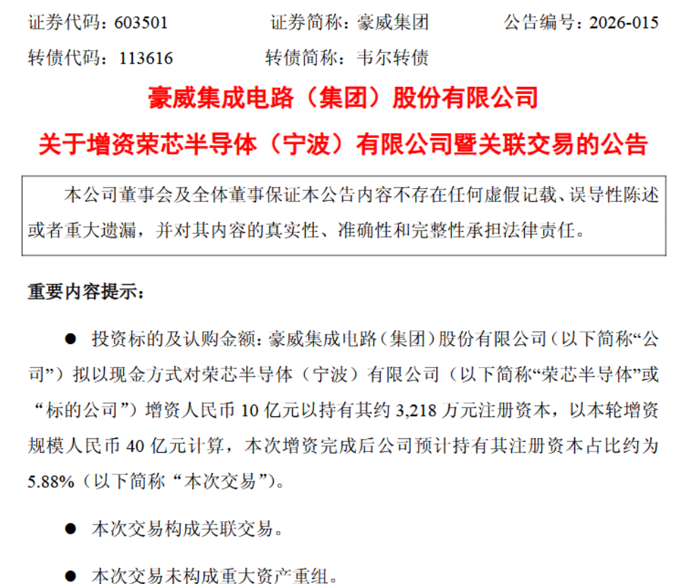 豪威集团宣布拟以现金方式向荣芯半导体(宁波)有限公司增资10亿元,获得其约5.88%的股权